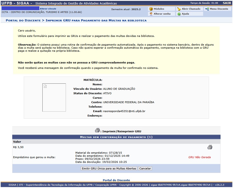 - SIGAA → Módulos → Portal do Discente → Biblioteca → Empréstimos → Imprimir GRU para pagamento de multas.