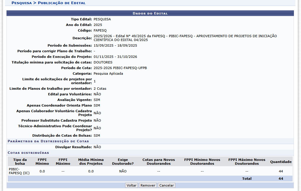Essa operação permite alterar e remover editais de pesquisa. O edital de pesquisa é um documento que disponibiliza cotas de bolsas e/ou financiamentos para docentes. Nele, constam regras específicas para o cadastro de projetos de pesquisa e planos de trabalho para docentes que desejem concorrer. Para utilizar esta funcionalidade, deve-se acessar: