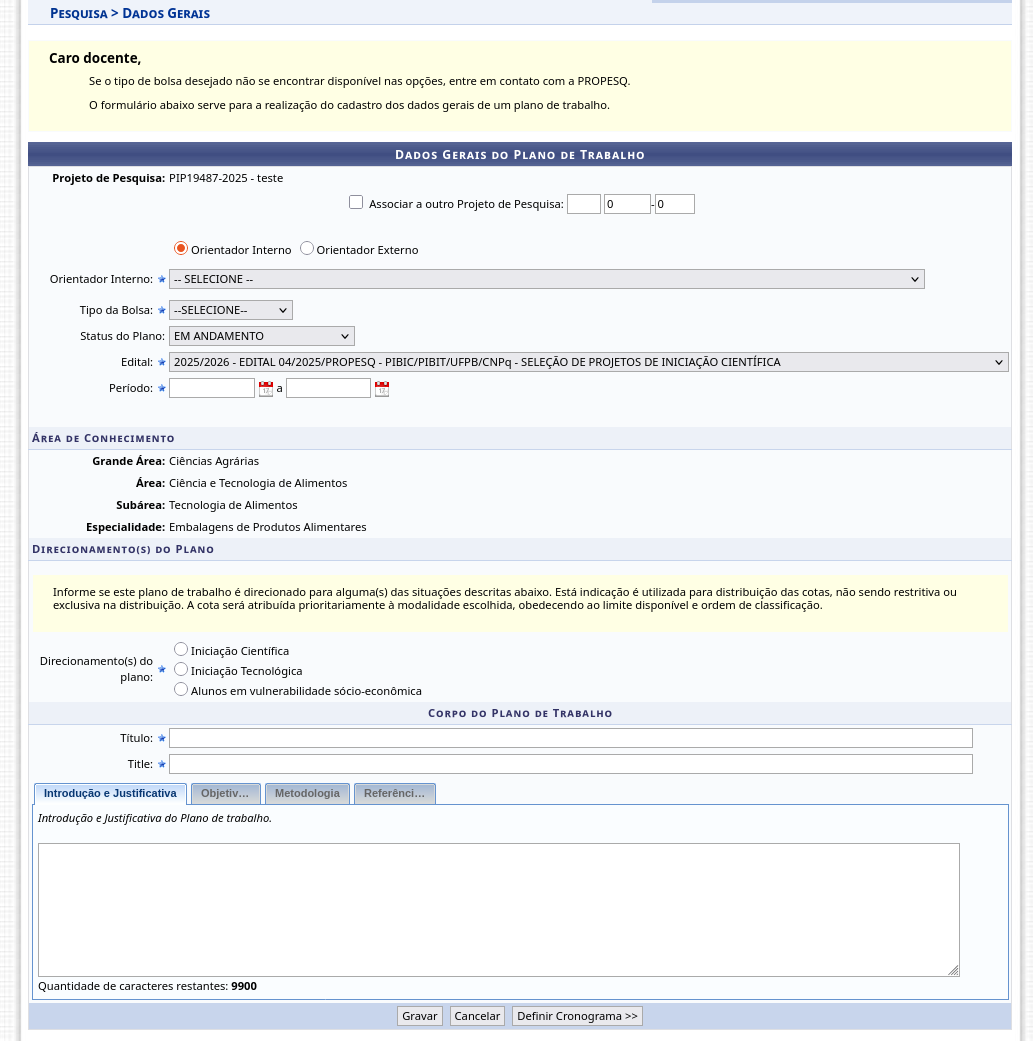- Direcionamento(s) do plano: o usuário deverá selecionar uma das três opções: Iniciação Científica, Iniciação Tecnológica ou Alunos em vulnerabilidade sócio-econômica.