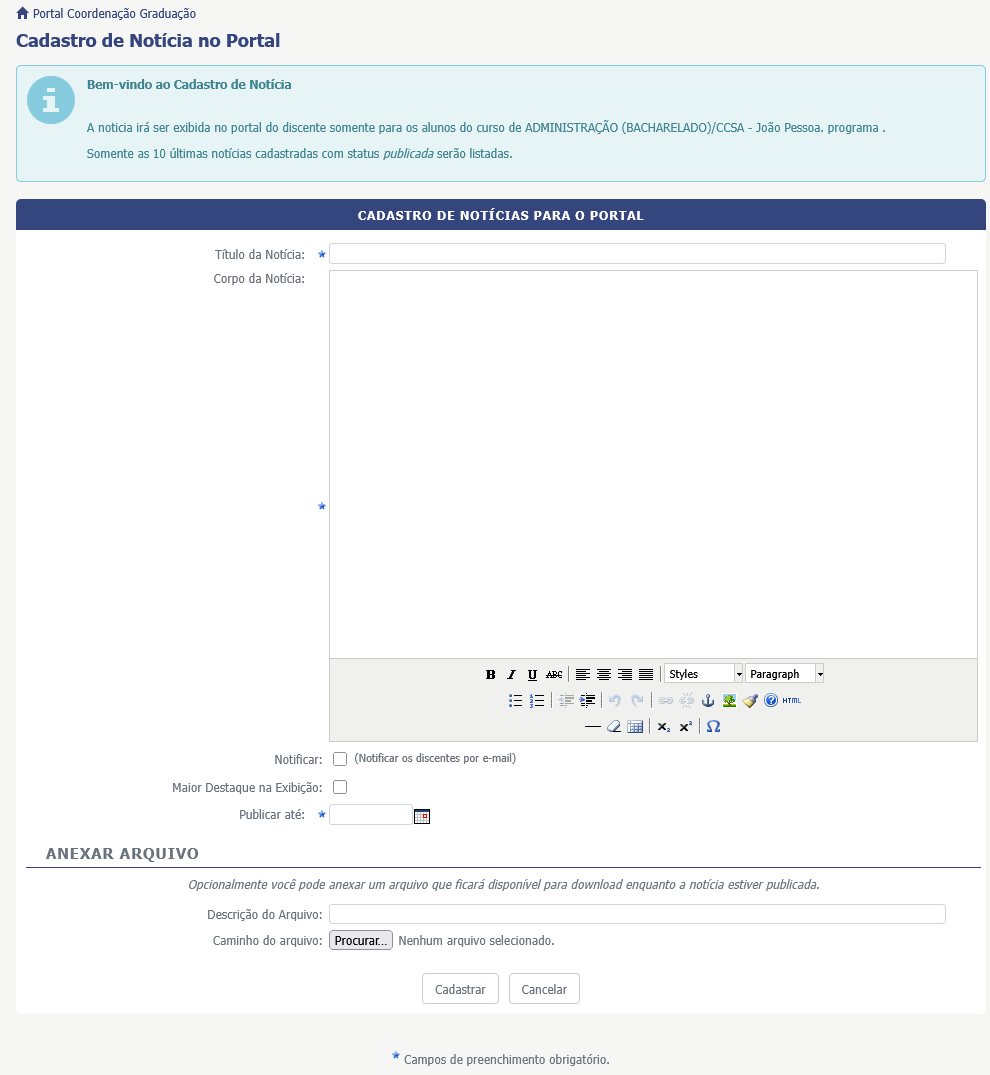 Para cadastrar uma notícia no portal de discente, o usuário deverá informar os seguintes critérios: