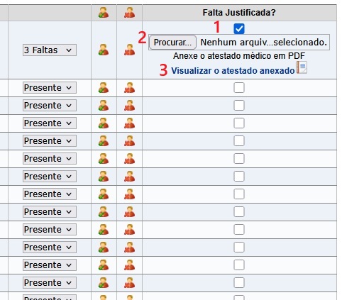 Como já foi dito anterniormente, apenas casos de falta amparados por lei serão abonados. Entretanto, no caso de falta por motivo de doença devidamente justificada com atestado médico, as faltas não deverão contar para o limite máximo de faltas permitido. Nesses casos o discente deve fornecer o atestado em formato pdf, o qual será anexado à frequência dos dias indicados no atestado. O cadastro do atestado no SIGAA ficará sob a responsabilidade do professor do componente curricular. No caso de componentes com mais de um professor, a responsabilidade será do docente que tiver ministrado as aulas/atividades no período informado. Veja os passos abaixo: